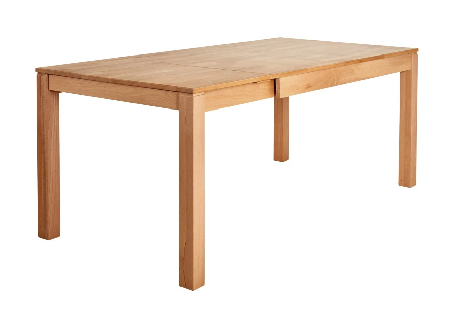 4-Fuß-Esszimmertisch in Kernbuche, geölt oder Eiche natur, geölt. Mit Auszug, mit innenliegender Einlegeplatte á 50 cm. Maße: L120–170xH75xT90 cm. Mit Aufbau-Anleitung