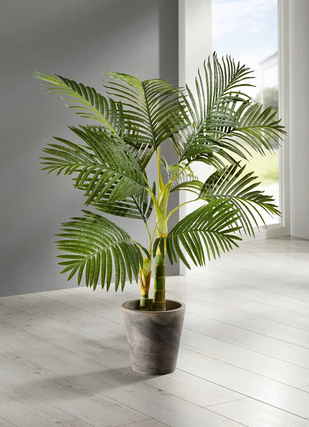 Für diese beeindruckende Arecapalme mit 9 Wedeln benötigen Sie keinen grünen Daumen, denn auch ohne Gießen bleibt sie selbst in den dunkelsten Ecken schön grün. Sie ist fest verankert in einem scharzen Kunststofftopf. Die Oberfläche ist mit Erdimitat abgedeckt. Aus hochwertigem Kunst- und Textilmaterial gefertigt.