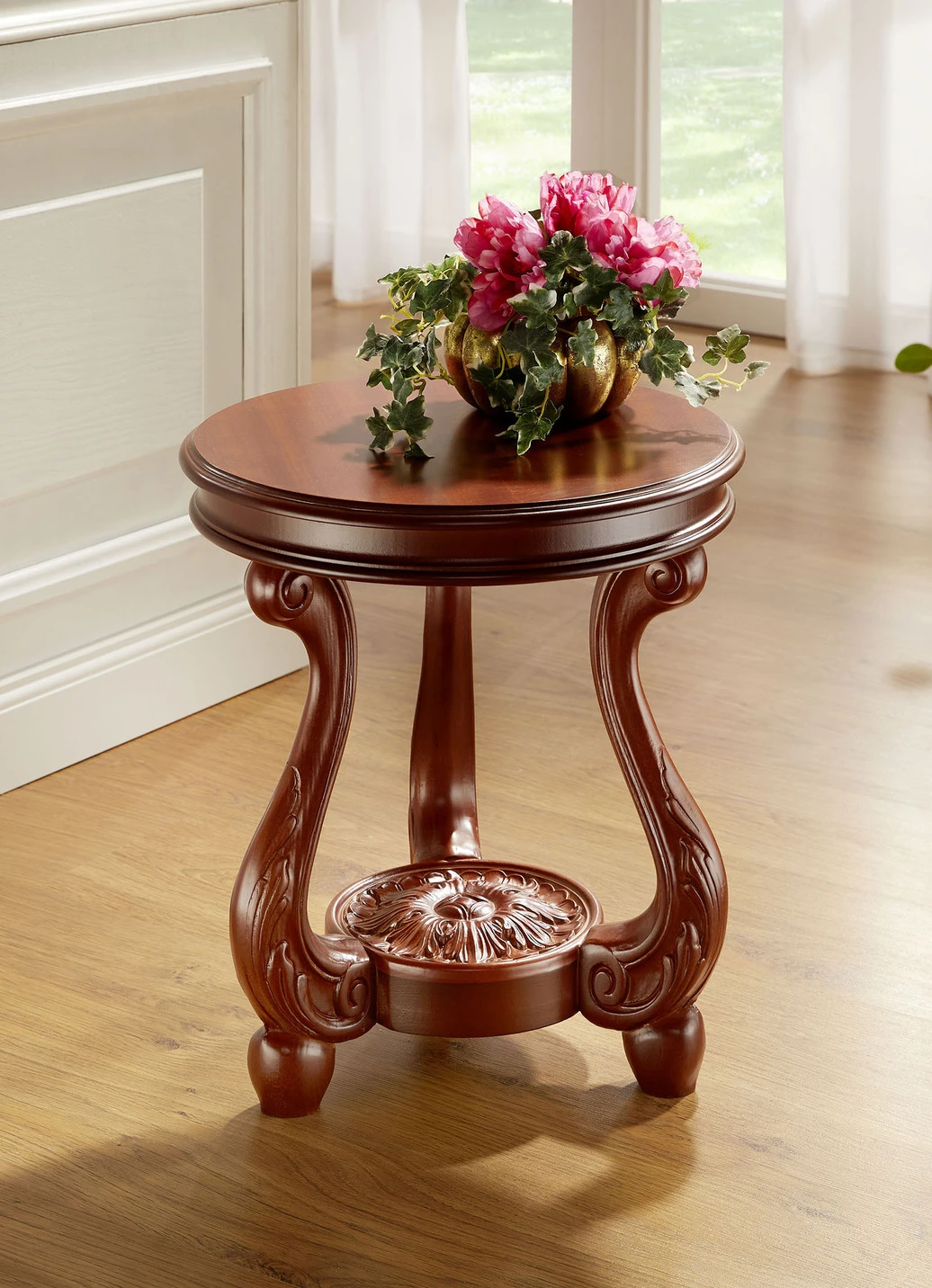 Setzen Sie einen royalen Akzent in Ihrem Wohnraum! Mit diesem schön gearbeiteten, teilmassiven Beistelltisch gelingt Ihnen das spielend. Das filigran geschwungene Gestell mit reichhaltiger Schnitzerei aus nussbaumfarbenem Buchenholz.