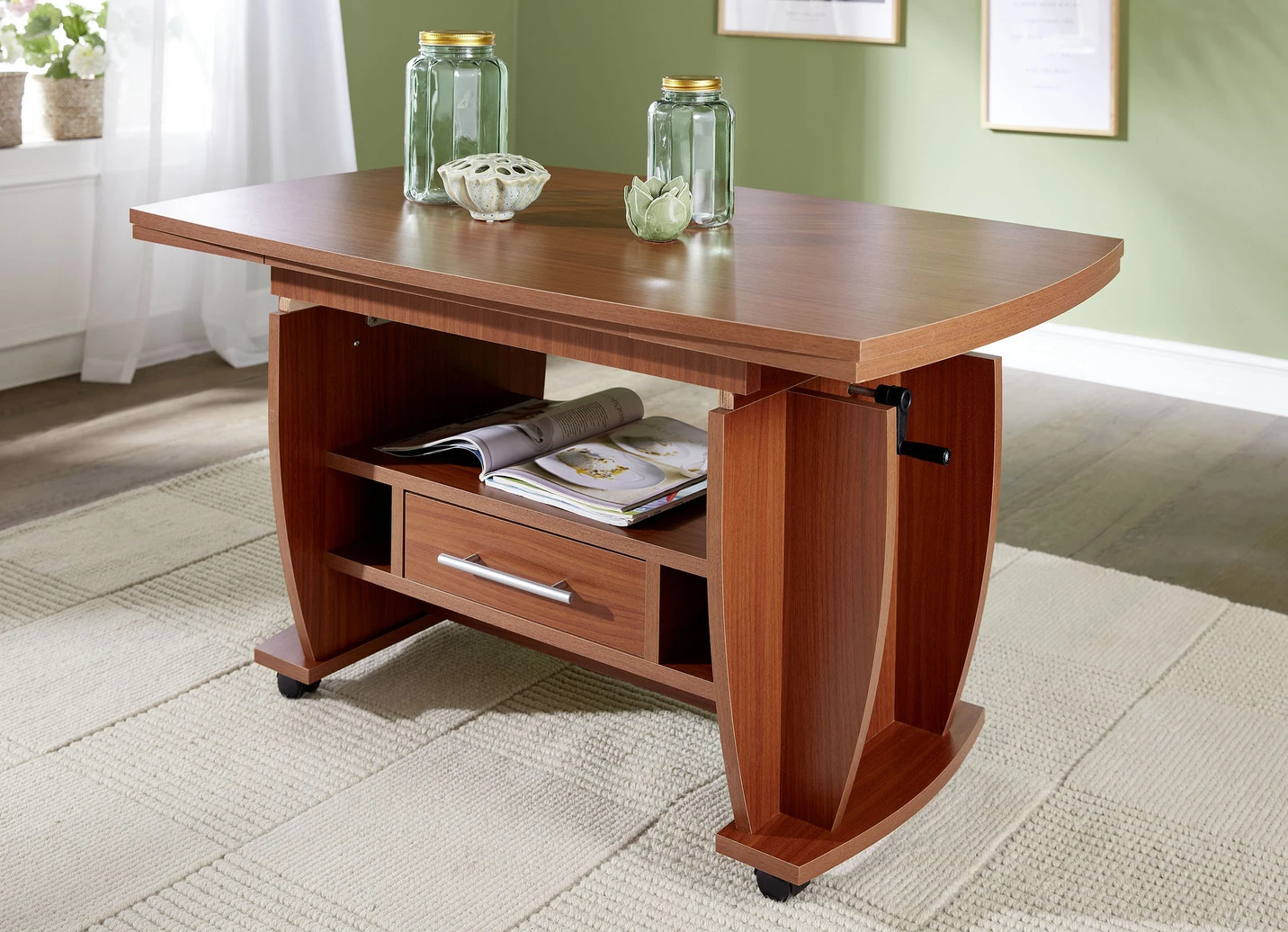 Moderner Couchtisch mit melaminbeschichteter Oberfläche, Ablageböden sowie von beiden Seiten zu öffnender Schublade. Auf 4 Rollen, 2 davon bremsbar. Mit Aufbau-Anleitung