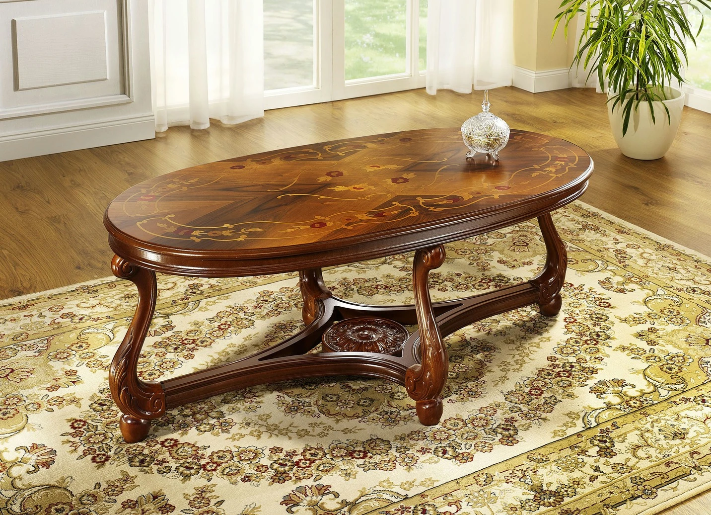 Setzen Sie einen royalen Akzent in Ihrem Wohnraum! Mit diesem schön gearbeiteten, teilmassiven Couchtisch gelingt Ihnen das spielend. Das filigran geschwungene Gestell mit reichhaltiger Schnitzerei aus nussbaumfarbenem Buchenholz wird veredelt durch die hochwertig gestaltete Tischplatte, die mit kunstvollen Intarsien gearbeitet ist. Maße: B119xH47xT63 cm. Die Lieferung erfolgt aufgebaut