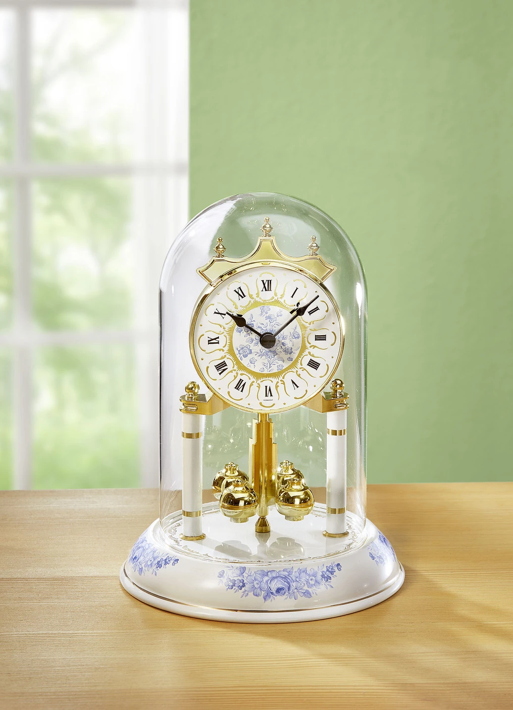 Ein außergewöhnlich edles Schmuckstück für Ihr Zuhause ist diese wunderschöne Uhr mit Drehpendeltechnik, Porzellansockel mit einem blauen Rosendesign und einer Mineralglasglocke. Das Zifferblatt ist mit römischen Ziffern und dekorativen, schwarzen Zeigern versehen. Hergestellt in Deutschland. Mit hochwertigem Quarzuhrwerk und messingfarbenem Pendel. Batteriebetrieben mit 1x 1,5 Volt Mignon (nicht im Lieferumfang enthalten). Maße: ø 15 cm, Höhe 22 cm