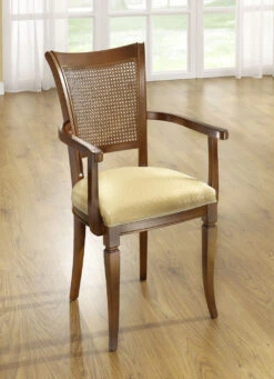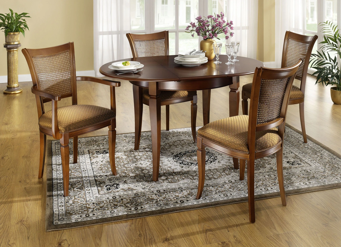 Elegante Esszimmermöbel in Nussbaum mit aufwendigen Schnitzereien an den Beinen. Die Stühle aus massivem Buchenholzgestell sind mit Wiener-Geflecht-Optik an den Rückenlehnen und Polyurethan-Schaumstoffpolsterung und Federkern in den Sitzflächen gefertigt. Stoffbezug aus 70% Polyester und 30% Acryl. Die Stühle werden aufgebaut geliefert