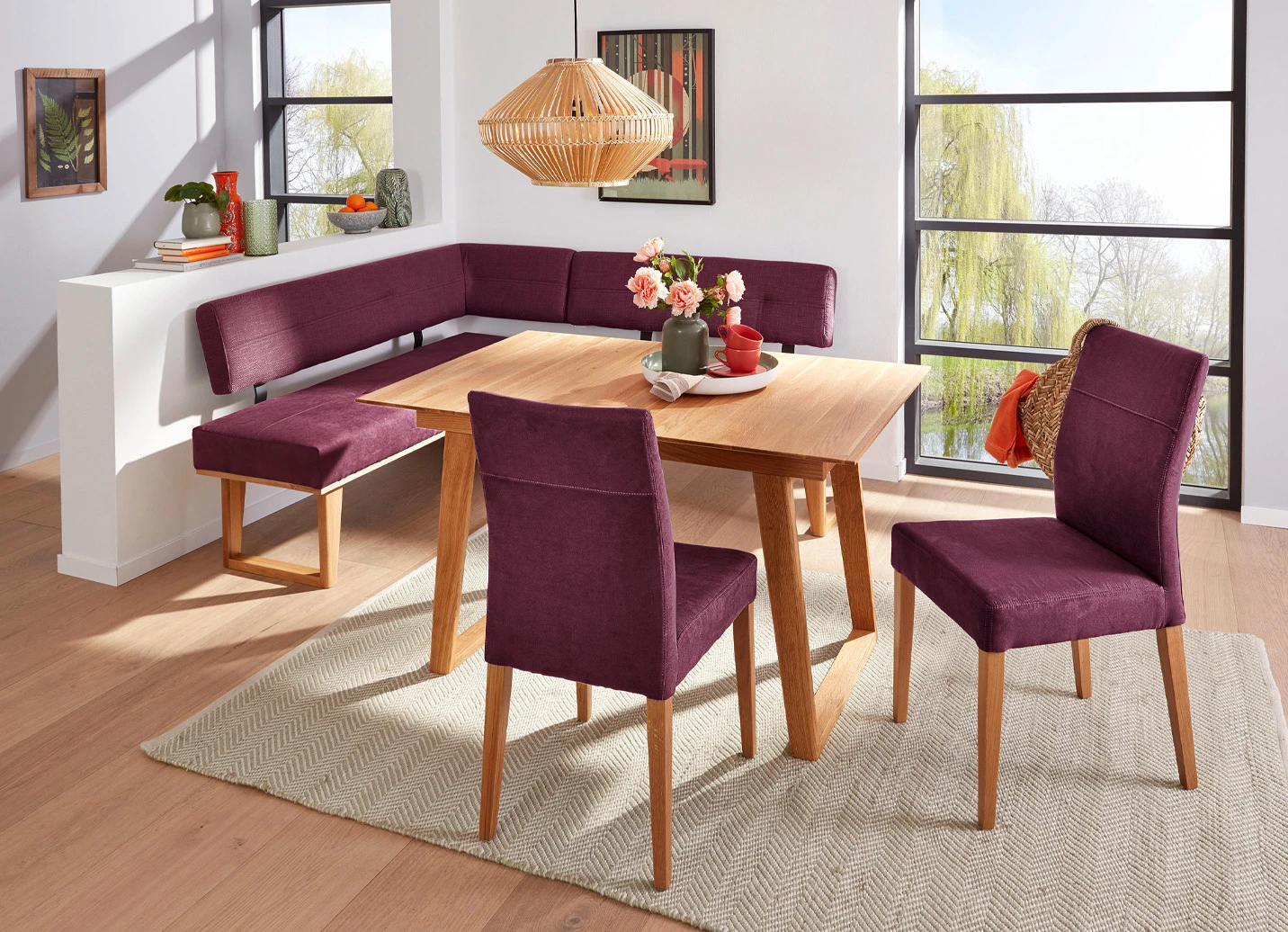 Esszimmermöbel aus naturbelassenem, massivem Eichenholz in der Ausführung Eckbankgruppe, 4-teilig, in den Maßen 192×167 cm sowie in Eiche-Bordeaux.