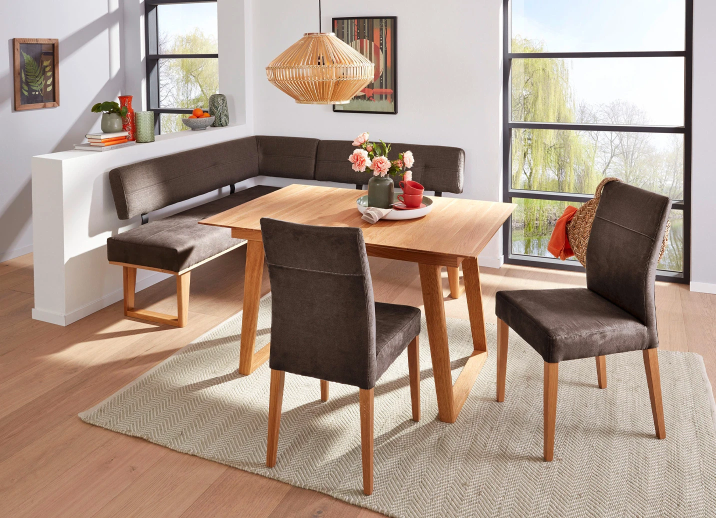 Diese stilsicheren Esszimmermöbel aus massivem, naturbelassenem lackiertem Eichenholz (Tisch in Eiche geölt) werden Sie mit ihrem dezenten Charme verzaubern! Durch die praktische Einlegeplatte (Breite 50 cm) ist der Tisch im Nu erweiterbar. Die Eckbank ist wahlweise mit dem kurzen Schenkel links oder rechts erhältlich. Die Rückenlehnen sowie die Sitzfläche der Eckbank und der Stühle sind mit hochwertigem Kombistoff aus Mikrofaser/Struktur bei der Eckbank und bei den Stühlen nur aus Mikrofaser (100% Polyester) in schönen, kombifreundlichen Farben mit aufwendig kantenumlaufenden Ziernähten bezogen. Mit Aufbau-Anleitung zur einfachen Selbstmontage, die Stühle werden aufgebaut geliefert