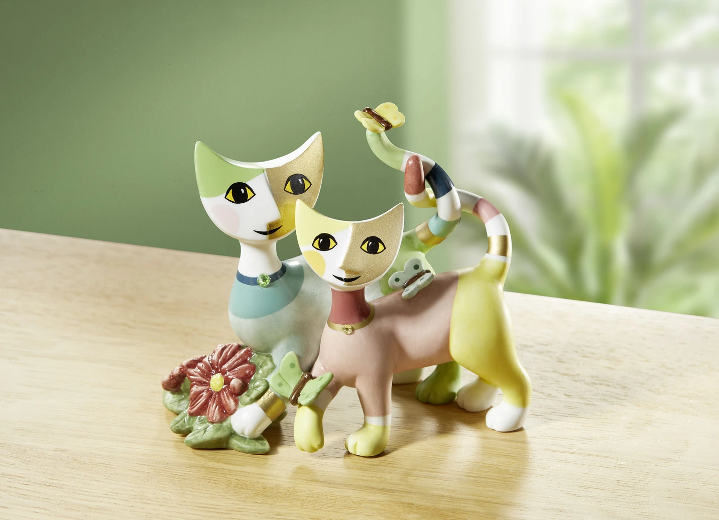 Exklusiv nur für uns hat das traditionsreiche Unternehmen „Goebel“ dieses Katzenpaar aus der Rosina Wachtmeister- Kollektion geschaffen. Verspielt und farbenfroh strahlen Sie um die Wette und schleichen sich in die Herzen aller Katzenfreunde. Verziert mit kleinen Blumen und bunten Schmetterlingen. Aus hochwertigem Biskuitporzellan von Hand gefertigt und bemalt. Limitiert auf 1.999 Stück. Mit Zertifikat.