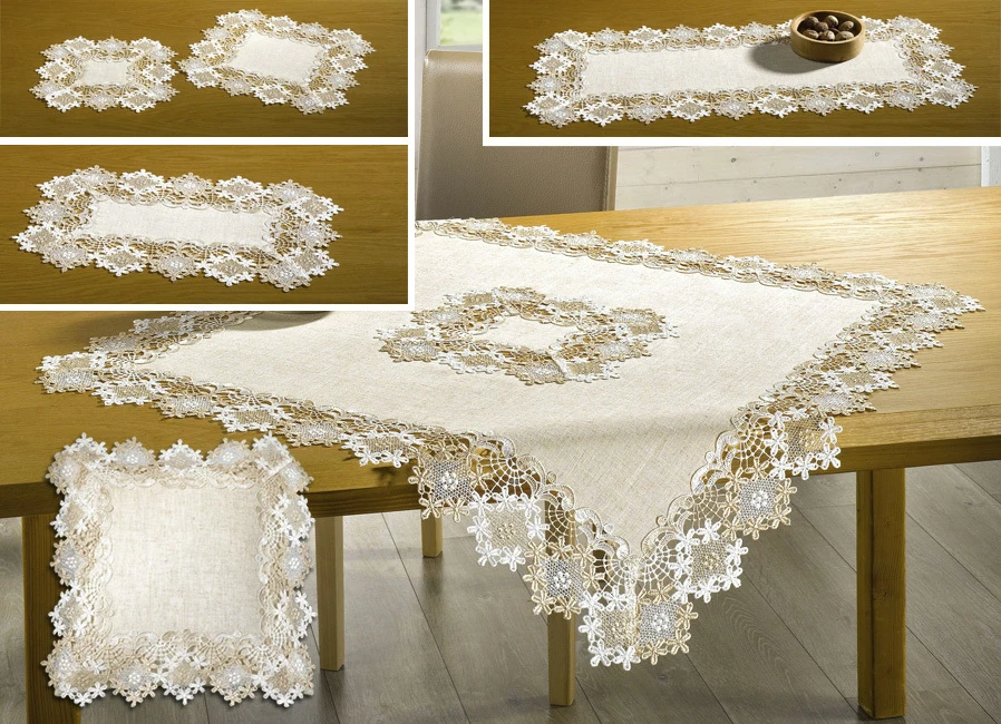 Geschmackvolle Tisch- und Raumdekoration mit Leinen in Größe 101 (Deckchen, 35/ 50 cm) und in Hellbraun.