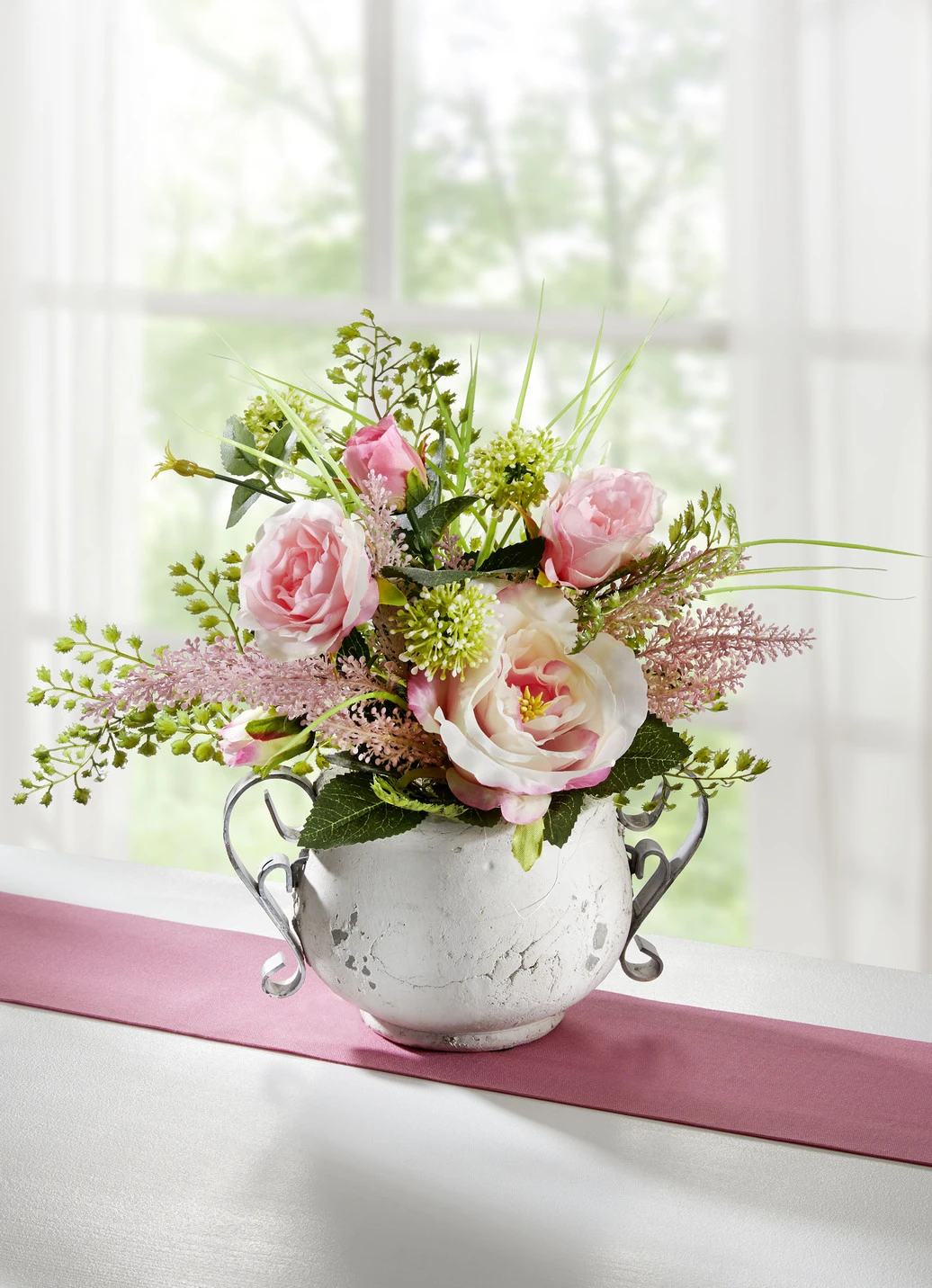 Gesteck in Topf aus Kunst- und Textilmaterial in Grün-Rosé.