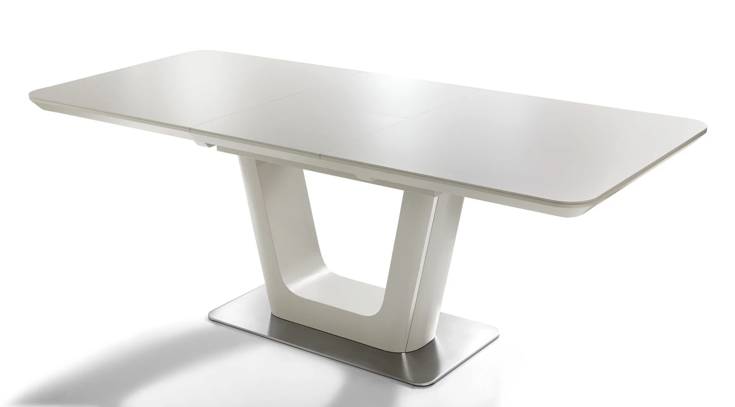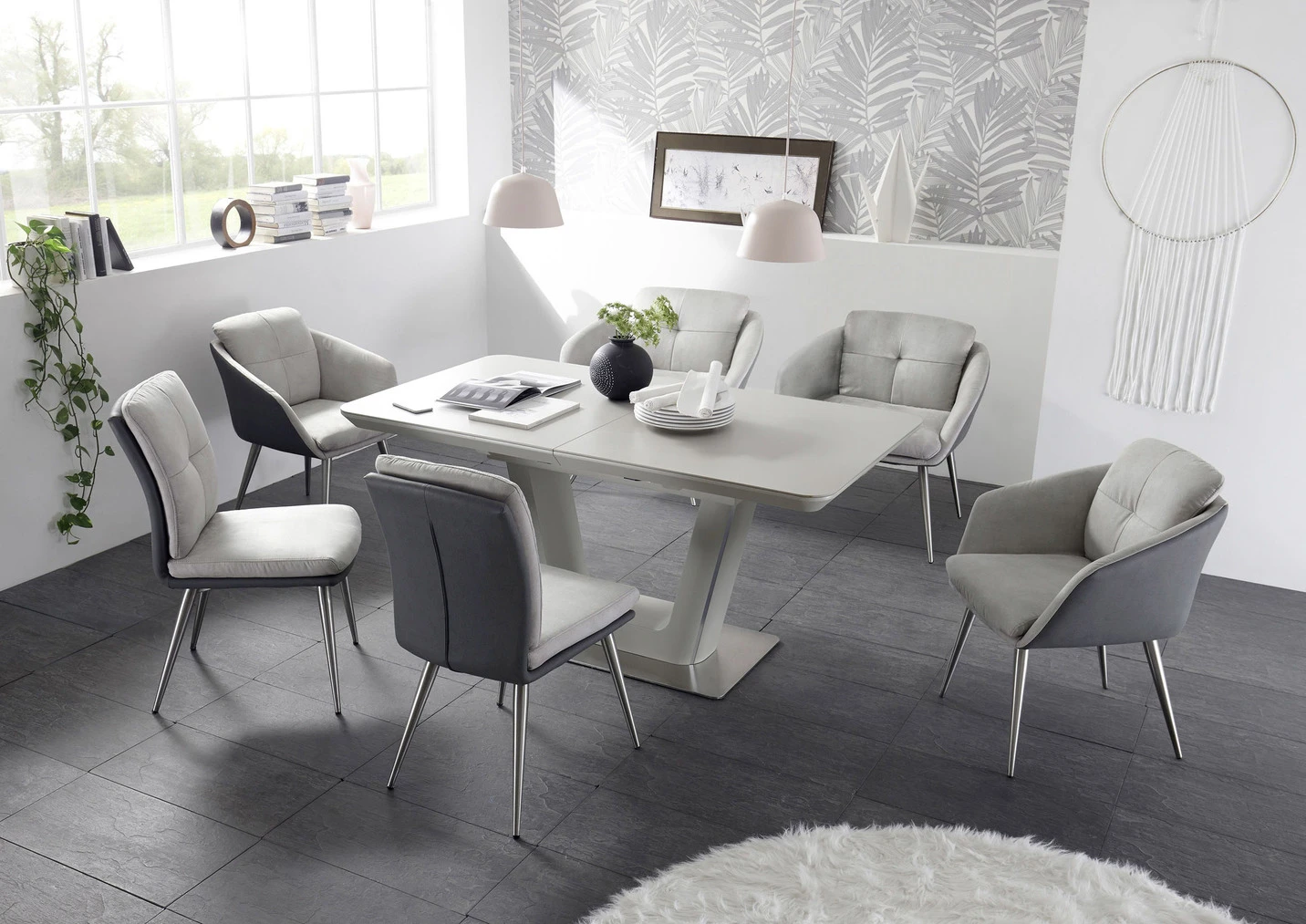 Diese hochwertigen und außergewöhnlichen Esszimmermöbel werden der neue Blickfang in Ihrem Wohnbereich werden. Die Stühle und der Arm lehnenstuhl sind auf konischen, gebürsteten Edelstahl füßen gefertigt, der Tisch ist um 50 cm auszieh- bar (hochwertiger Synchronauszug). Die Rücken- und Armlehnen sind mit angenehmem, grauen Stoff (100% Polyester) bezogen. Mit Aufbau-Anleitung