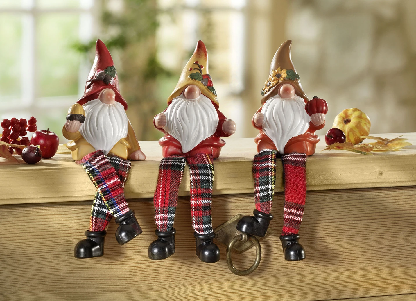 Eine herbstliche Atmosphäre zaubern Sie mit diesem süßen 3er-Set Kantenhocker in Ihr Zuhause. 3 Wichtel mit lustigen Zipfelmützen präsentieren stolz ihre gesammelten Werke. Aus Keramik gefertigt. Mit Schlenkerbeinen aus Stoff. Maße: je B7xH10xT6 cm