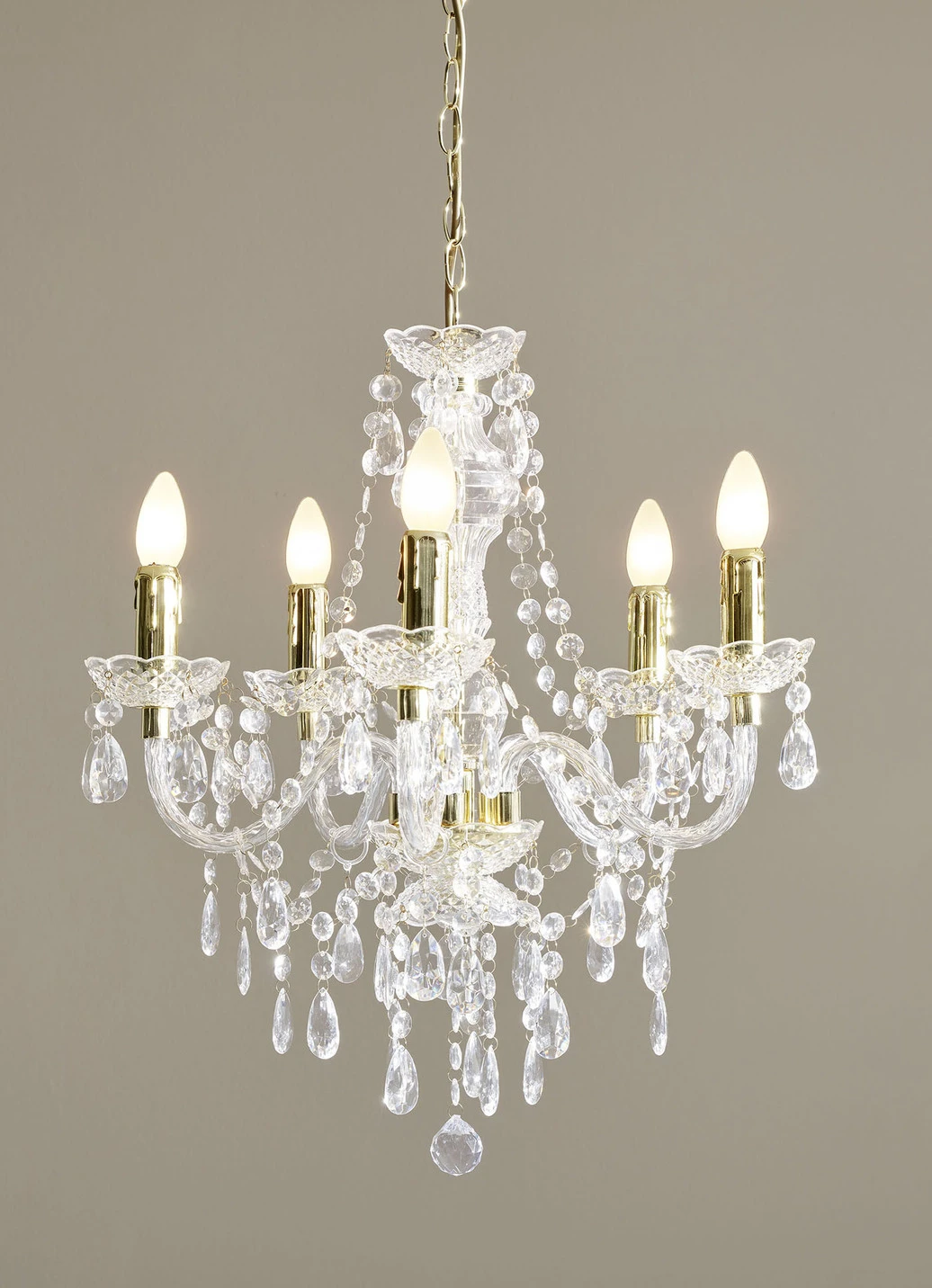 Geradezu royalen Glanz verbreitet dieser wunderbare Kronleuchter in Ihrem Zuhause. Aus messingfarbenem Metall und Behang aus Kunststoff gefertigt. Fassung 5x E14, 230 Volt, max. 40 Watt. Maße: Höhe mit Abhang insgesamt 150 cm; ø 52 cm. Die Lieferung erfolgt ohne Leuchtmittel.