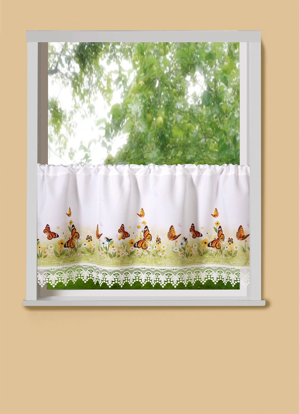 Eine frühlingshafte Blumenwies mit Schmetterlingen erstreckt sich über den exquisiten Kurzstore der mit einer schönen Häkelspitze im Abschluss gearbeitet ist.