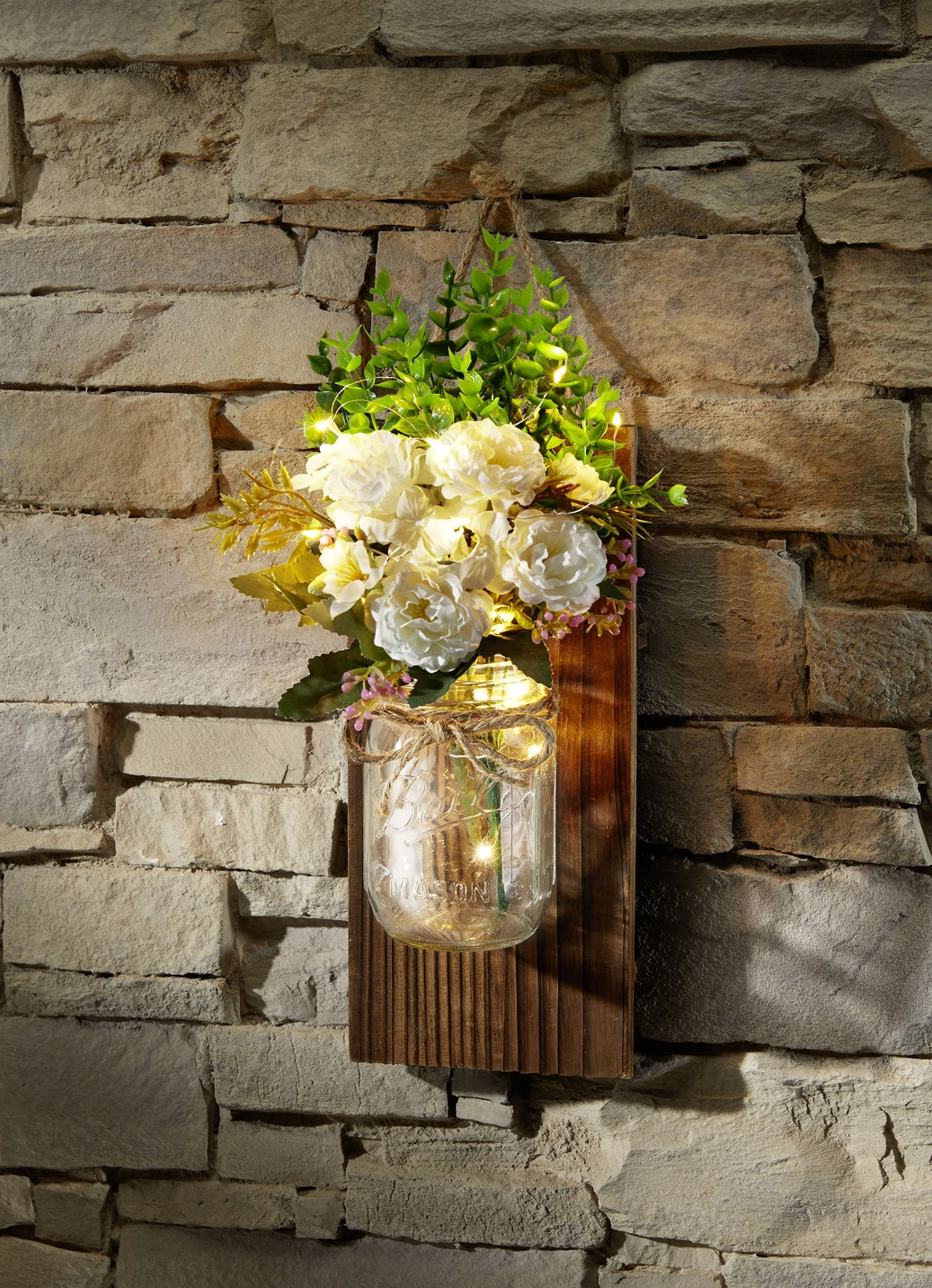 In einem Einmachglas steckt ein tolles Blumenarrangement, das auf einem Holzpaneel befestigt wurde. Die eingearbeitete 20-flammige LED-Lichterkette bringt das Ganze zum Strahlen. Batteriebetrieben mit 3x 1,5 Volt Mignon (nicht im Lieferumfang enthalten). Mit 6-Stunden-Timer. Aus hochwertigem Kunst-und Textilmaterial gefertigt.