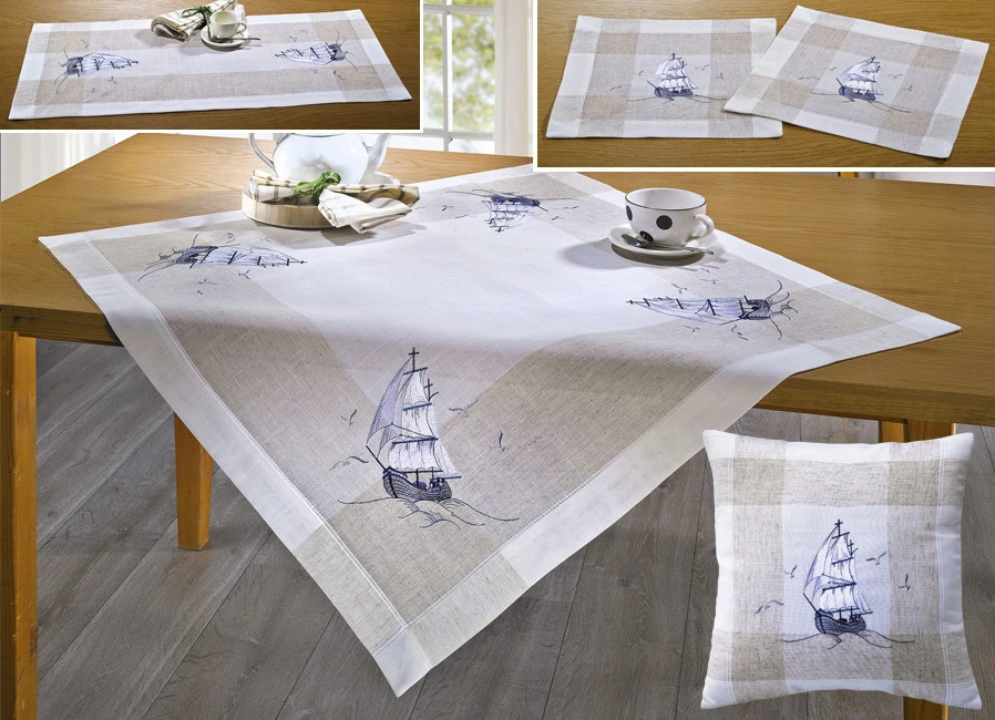 Für eine angenehme Atmosphäre sorgt diese mit Schiffsmotiven bestickte Tisch- und Raumdekoration. Kissenbezug mit Reißverschluss. Die Qualität: 100% Polyester. Waschbar bis 40 °C
