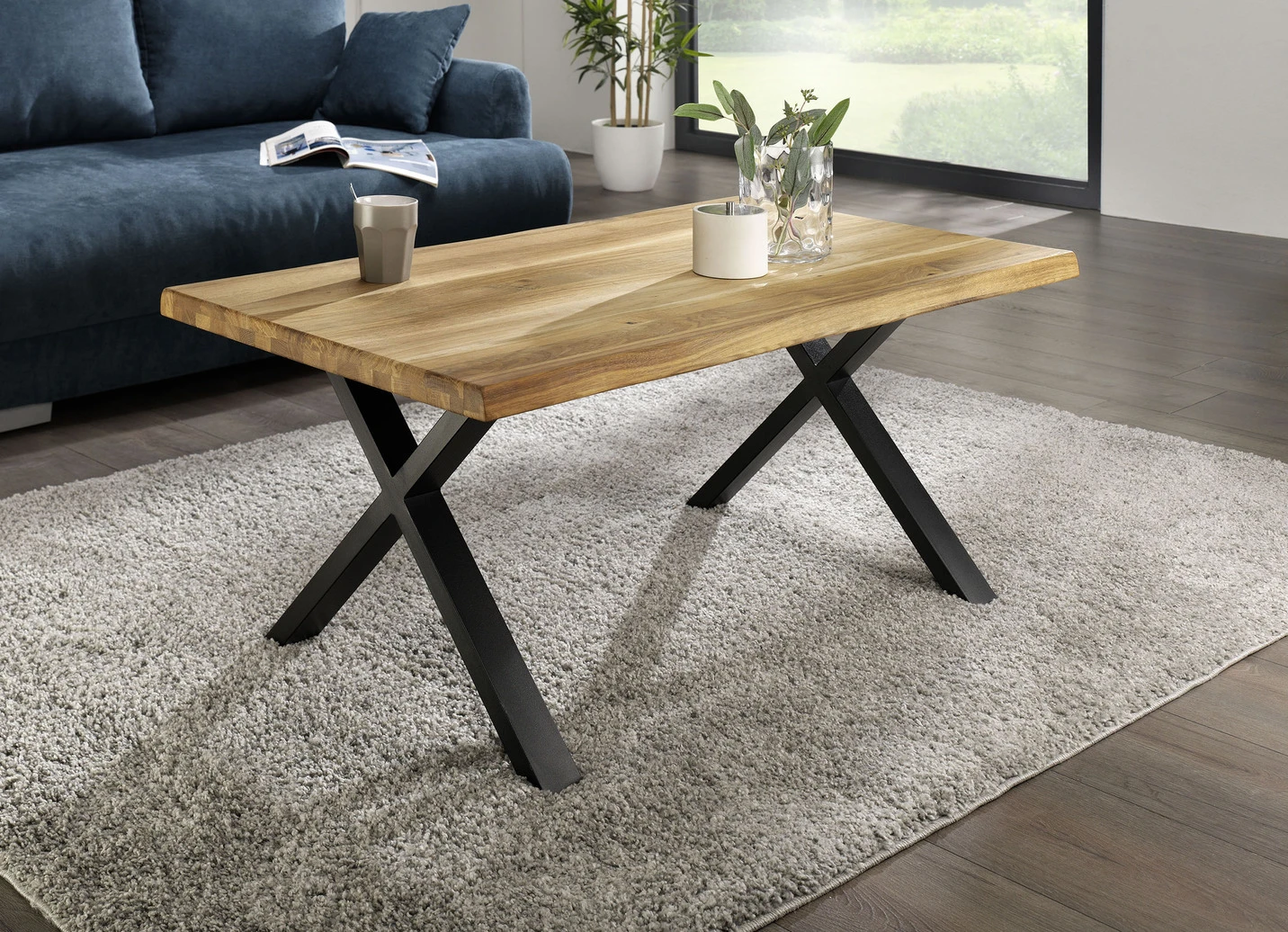 Moderner Couchtisch mit rustikaler Baumkante in Eiche.