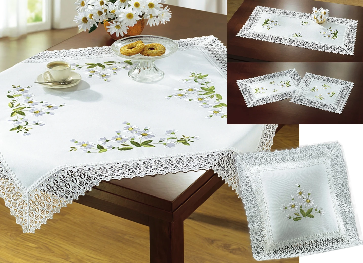 Pflegeleichte Tisch- und Raumdekoration mit Gänseblümchen-Stickerei in Größe 130 (Deckchen, 40/ 40 cm) und in Weiss.