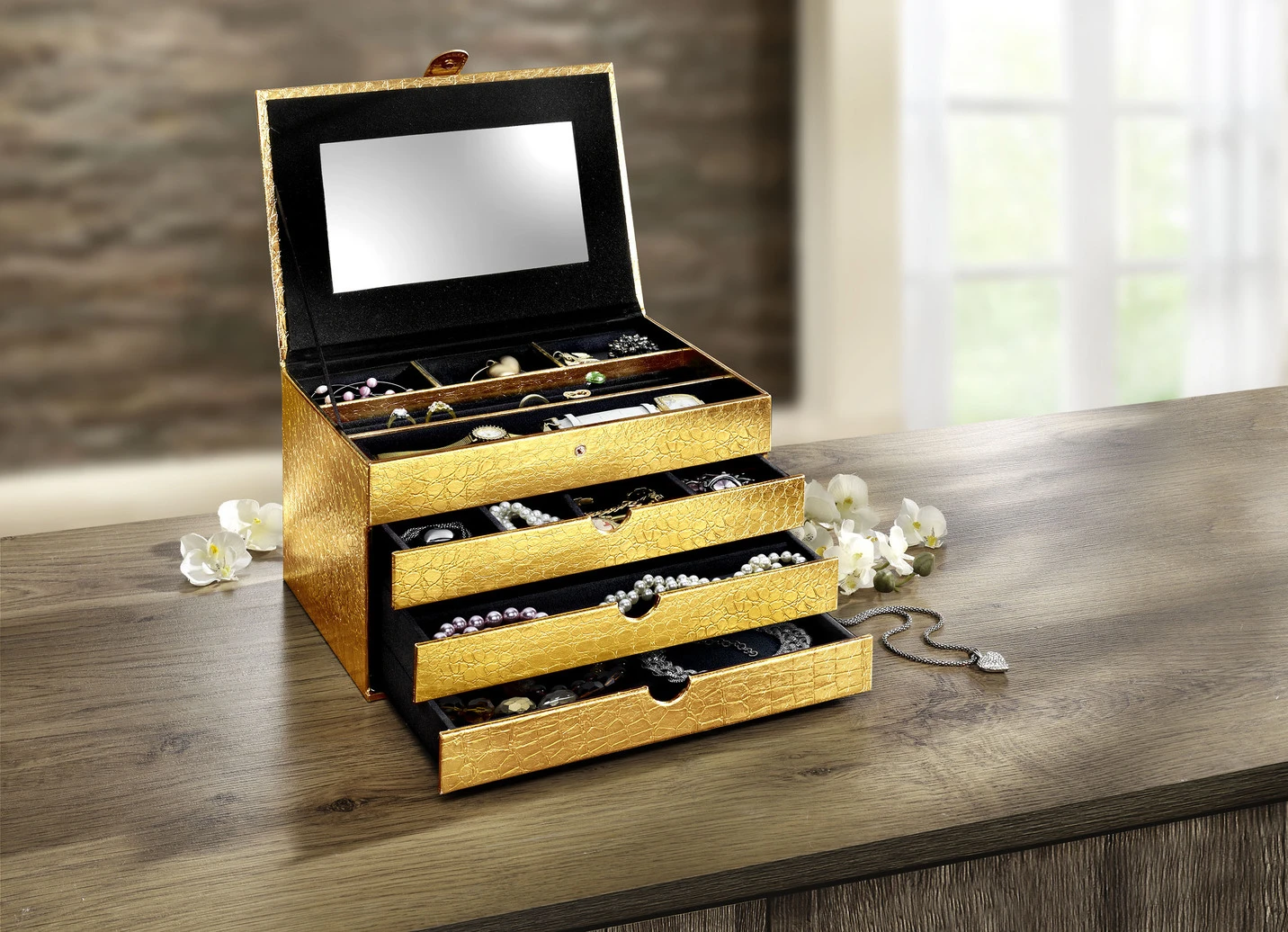 Praktischer Schmuckkoffer aus Lederimitat in Kroko-Optik. Innen mit weichem Veloursbezug ausgeschlagen bietet er mit 3 Schubfächern und 1 Fach mit Klappdeckel reichlich Platz. Mit integriertem Spiegel. Die Lieferung erfolgt ohne Inhalt.