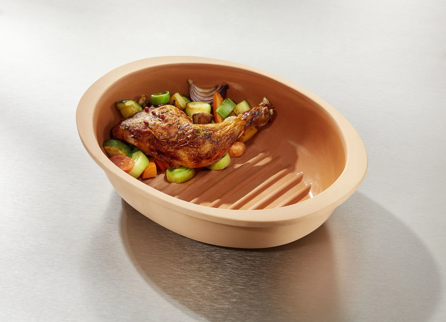für gesundes, vitamin- und nährstoffschonendes Garen. Ideal für die fettfreie, kalorienarme, aromareiche und gesundheitsbewusste Küche. Der im Backofen und in der Mikrowelle universell einsetzbare Bräter bereitet Gemüse dank Aromastegen knackig und frisch zu. Diese verhindern, dass das Gemüse oder auch Fleisch im eigenen Saft schmort. Optimale Hitzeverteilung – alles wird gleichzeitig und auf den Punkt gar. Lange Wärmespeicherung: so bleibt ihr Gericht warm und lecker. Aus Naturton – ohne Aluminium und Nickel. Schnitt- und Kratzfest, hygienisch und sauber. Spülmaschinengeeignet. Für bis zu 3 Personen bzw. 2,4 l Inhalt. Maße: L33,5xB24xH14,5 cm.