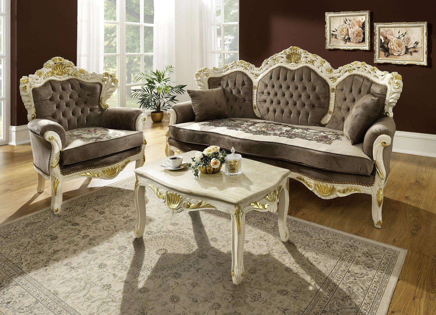 Schmuckvolle Wohnzimmermöbel mit weiß-goldfarbener Lackierung in der Ausführung Tisch mit Marmorplatte und in Weiss-Gold.