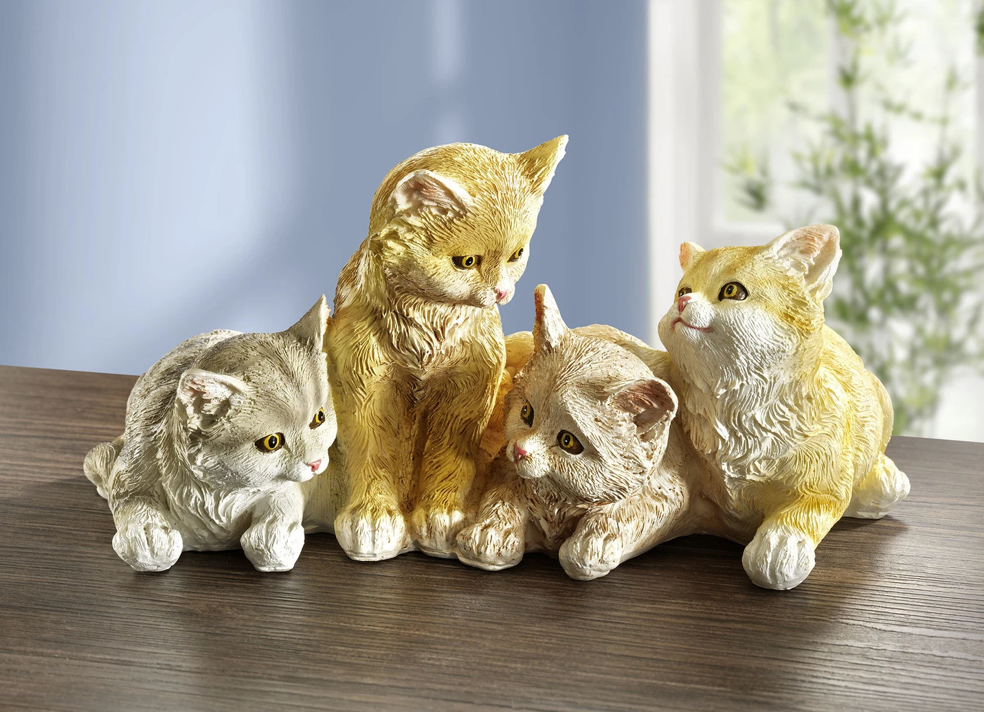 Diese vier trolligen Kätzchen, die sich eng zusammen schmusen, sind ein lieblicher Blickfang in Ihrem Wohnraum! Sorgfältig aus Polyresin gestaltet und detailliert bemalt. Maße: B26xH13,5xT14 cm