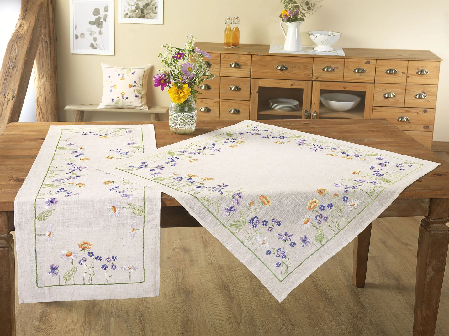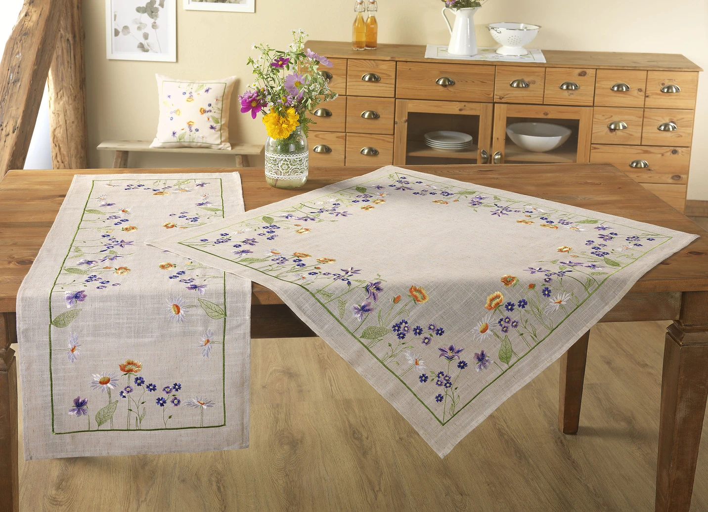 Schön bestickte Tisch- und Raumdekoration in Größe 101 (Deckchen, 35x 50 cm) und in Natur-Bunt.
