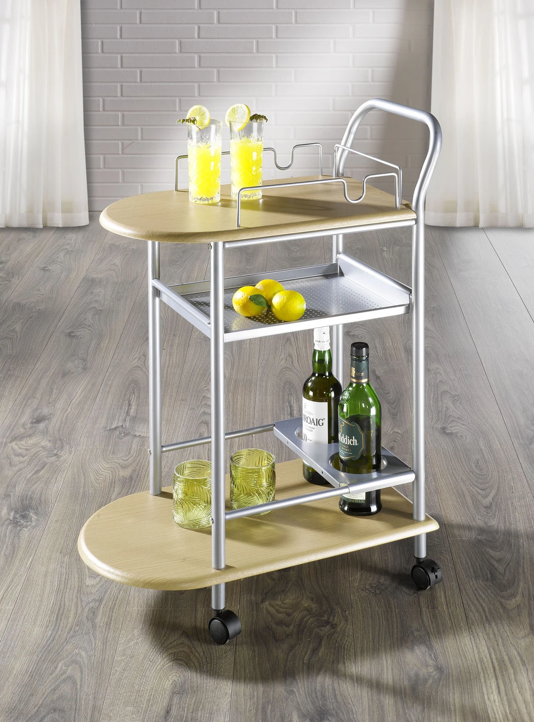 Immer praktisch und dank seiner 4 Rollen (davon 2 feststellbar) auch immer in der Nähe, wenn man ihn braucht! Der tolle Servierwagen aus alufarbenem Stahlrohr verfügt über 2 Ablagen aus MDF mit Kunststoffoberfläche in der Farbe Buche sowie 1 kleinere Ablage aus Metall. Inklusive Flaschenhalter. Mit Griff.