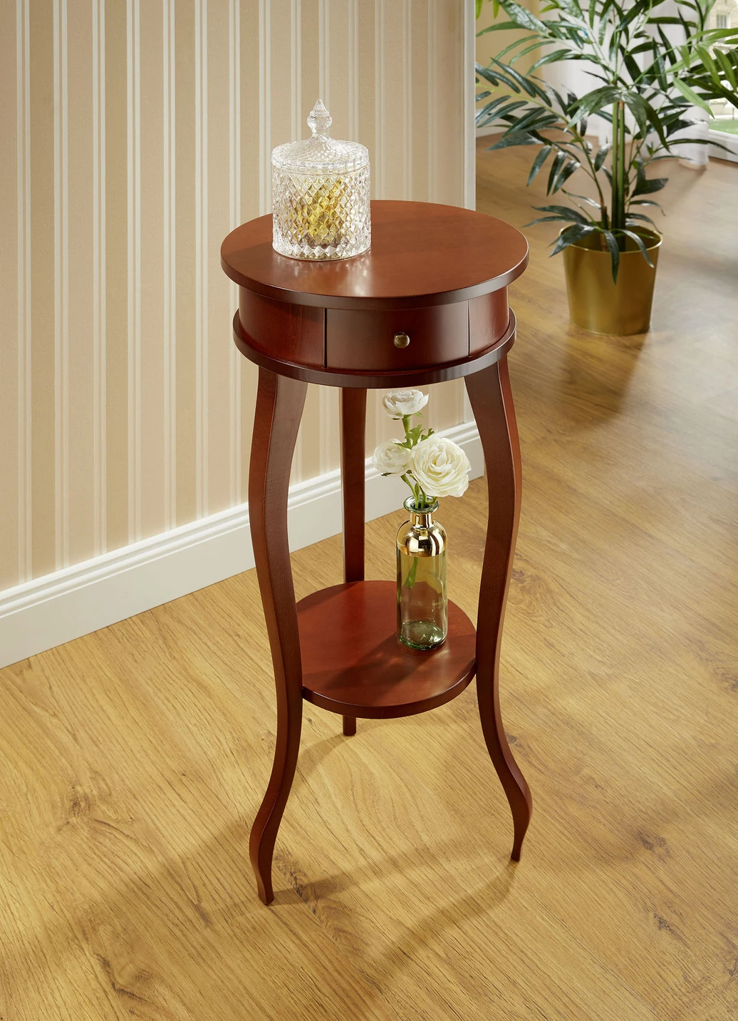 Stilsicherer, teilmassiver Beistelltisch in Nussbaum für den typisch italienischen Blickpunkt in Ihrem Zuhause. Mit kleiner Schublade mit Metallknopf unter der runden Tischplatte sowie praktischer Ablage unten. Die Lieferung erfolgt aufgebaut
