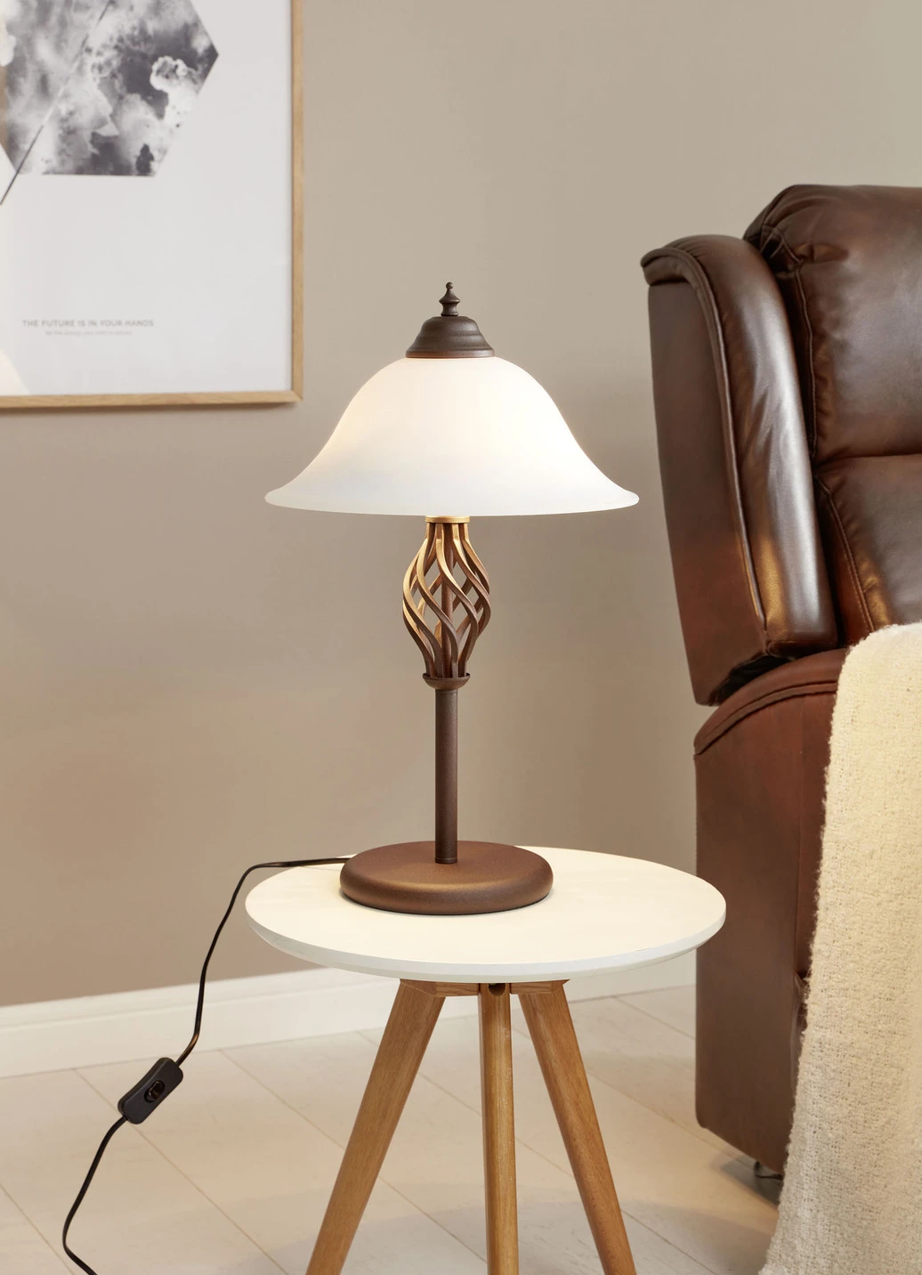Tischleuchte aus Metall mit Glasschirm in Rost.