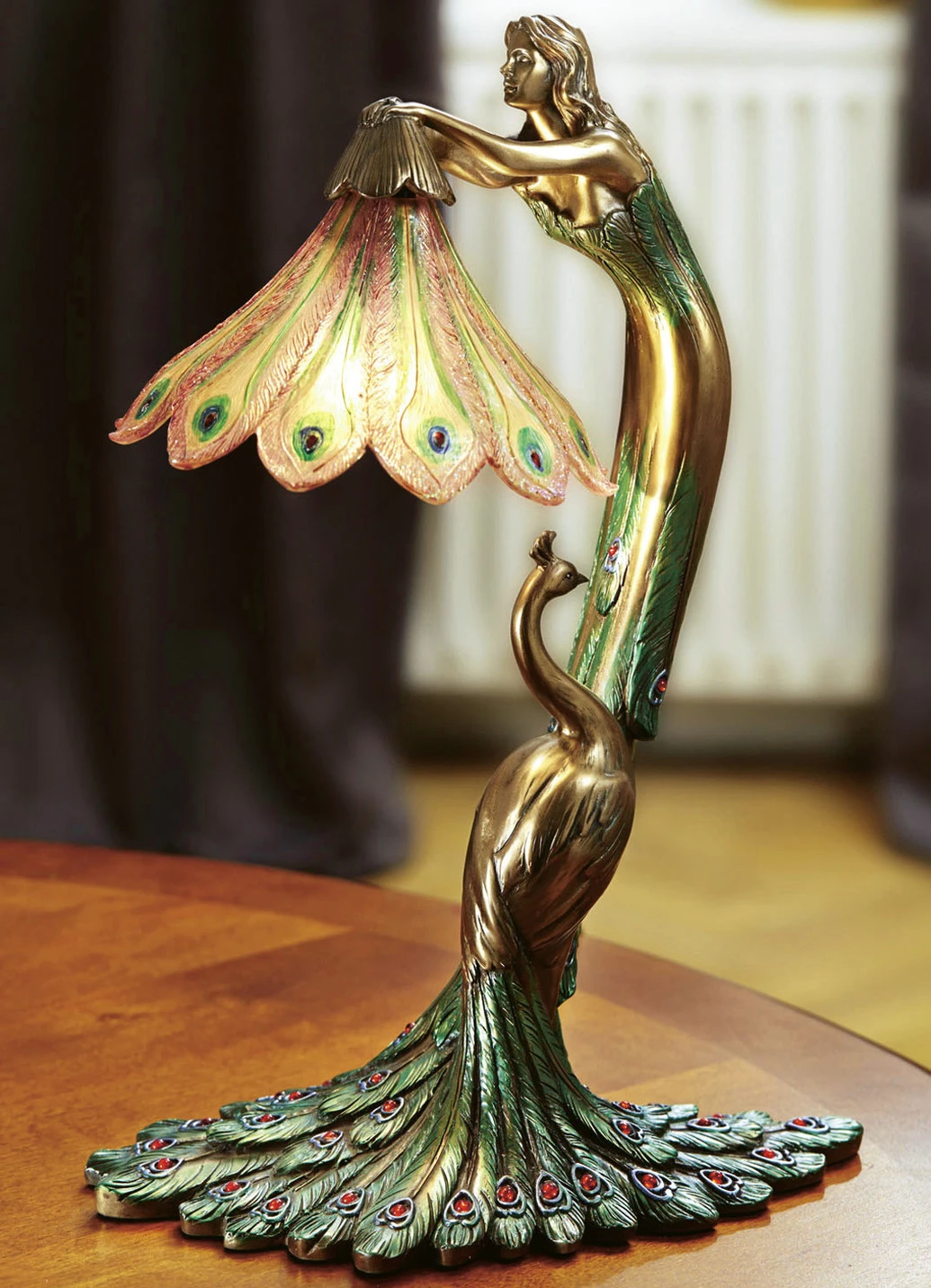 Außergewöhnlich gestaltete Tischleuchte in Form einer Frauenfigur mit einem Pfau aus Polyresin. Fassung E14, max. 25 Watt, 230 Volt. Mit Schnurzwischenschalter. Die Lieferung erfolgt ohne Leuchtmittel.
