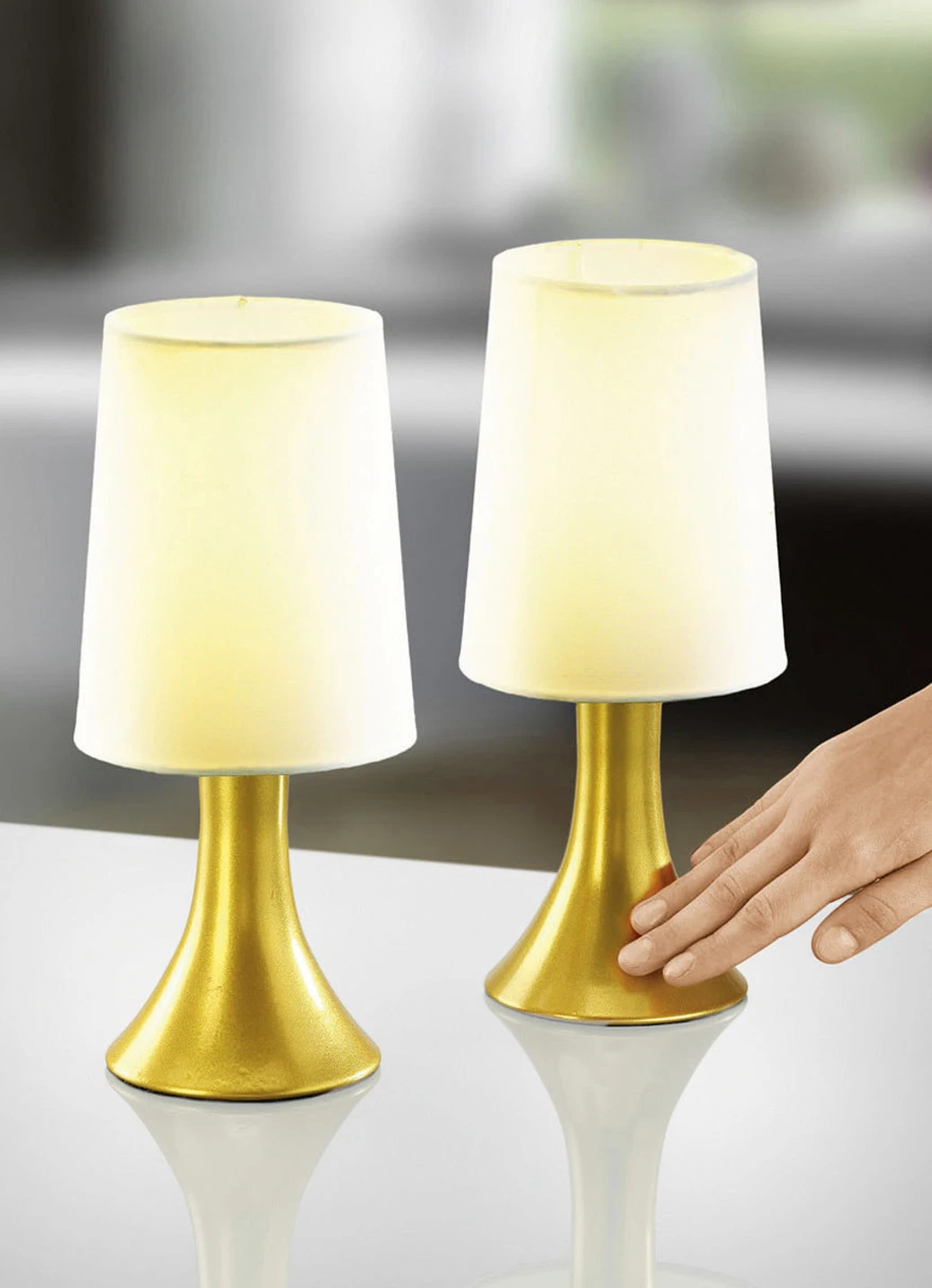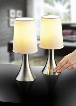 Eine perfekte Verschmelzung von Stil, Eleganz und praktischem Nutzen sind diese Touch-Leuchten! Der formschöne Fuß aus gebürstetem Nickel in silber- oder goldfarbenem Design wird wirkungsvoll durch den weißen Lampenschirm aus Stoff ergänzt. Eine leichte Berührung des Lampenfußes genügt und schon erleuchtet ein dezenter Lichtschein den Raum. Die Helligkeit ist durch zwei weitere Berührungen intensivierbar, bei der vierten Berührung erlischt das Licht. Max. 230 Volt, 25 Watt, Fassung je E14 (Leuchtmittel nicht im Lieferumfang enthalten), Zuleitung je 1,48 m.