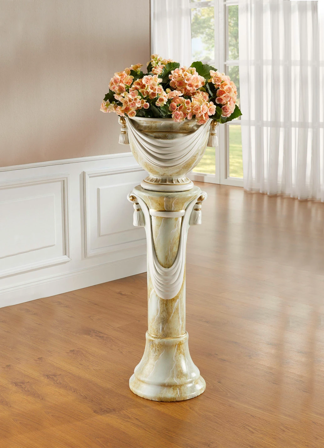 Maße: Höhe 101 cm; Säule H75 cm, ø 30 cm; Übertopf H26 cm, ø 37 cm, ohne Pflanzendekoration.