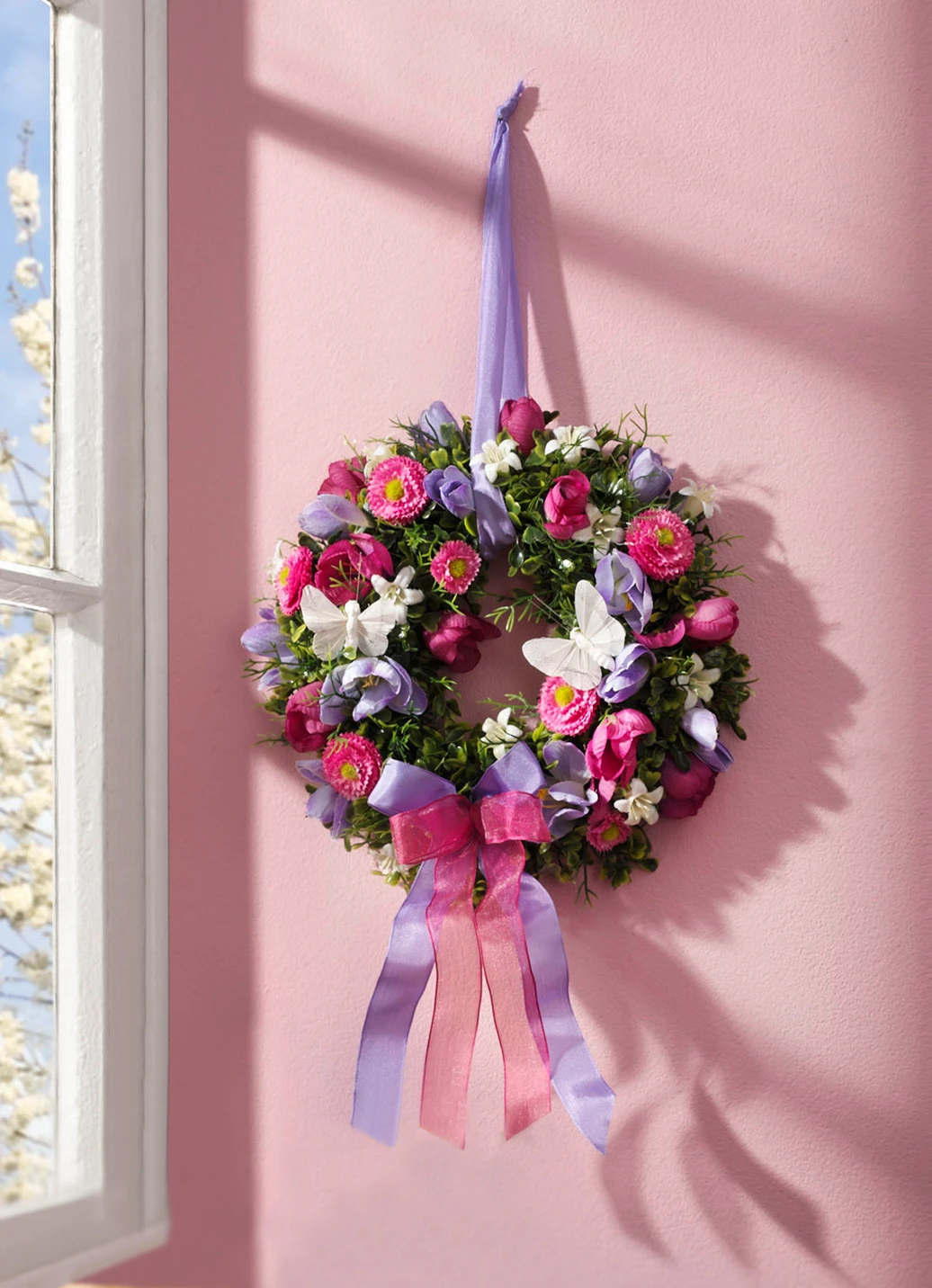 Dieser bezaubernde Wandkranz verschönert Ihr Zuhause! Auf einer Buchsbaumbasis sind fliederfarbene Krokuse und pinkfarbene Bellis-Blüten aufgearbeitet. Kleine weiße Schmetterlinge und zwei farblich passende Textilschleifenbänder runden das Arrangement stilvoll ab.
