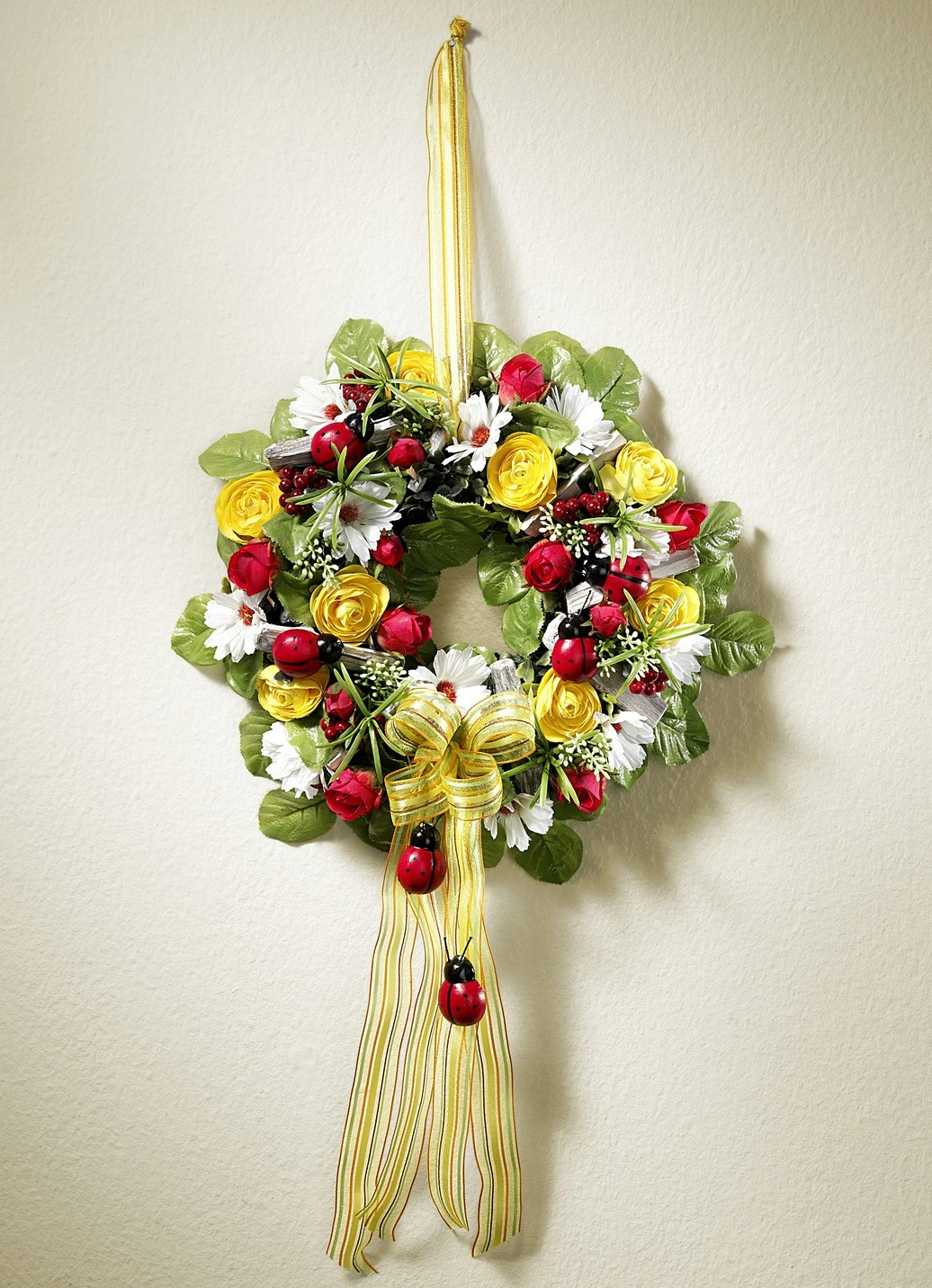 Eine auffallend schöne Dekoration an der Wand oder für eine Tür ist dieses Modell. Auf einen Buchsbaumkranz sind gelbe Ranunkeln, rote Rosen, weiße Margeriten, Hölzer und Marienkäfer gearbeitet. Das farblich passende Textilschleifenband rundet das Arrangement stimmig ab. Aus Kunst- und Textilmaterial gefertigt.