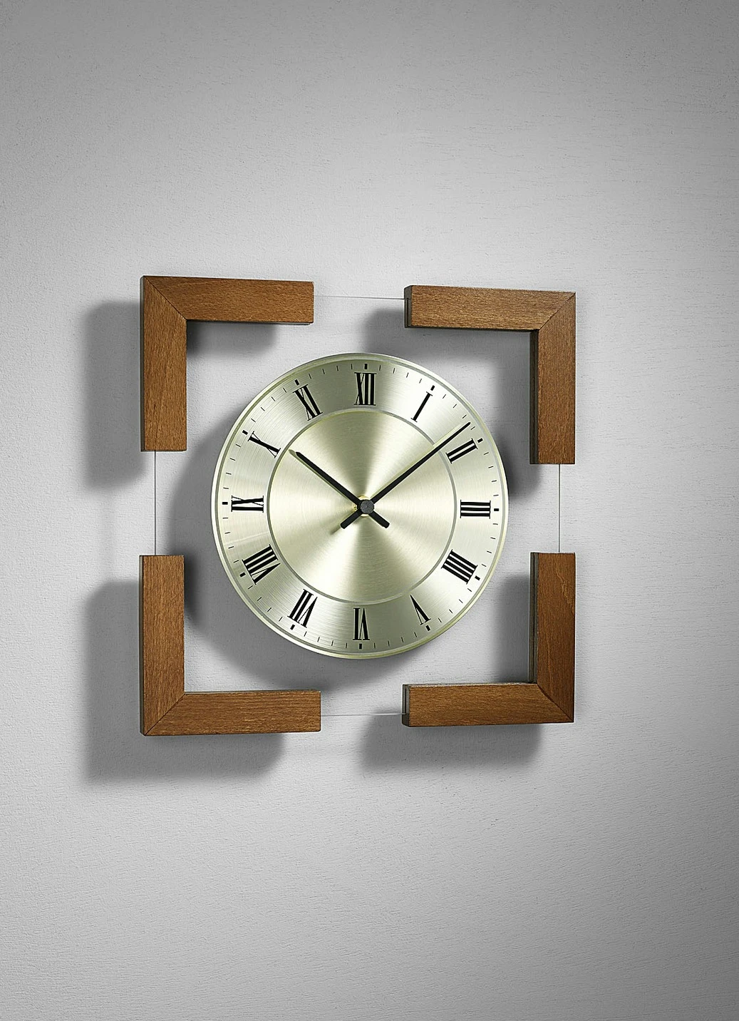 Hochwertige, quadratische Wanduhr aus Glas, mit dekorativen Eckleisten aus massivem Holz. Hergestellt in Deutschland. Mit diamantgedrehtem Aluminium-Zifferblatt, bei eiche und nussbaum in Messingoptik. Mit römischen Ziffern, schwarzen Zeigern sowie ganggenauem Funkwerk. Batteriebetrieben mit 1x 1,5 Volt Mignon (nicht im Lieferumfang enthalten). Maße: B27,5xH27,5xT1,5 cm.