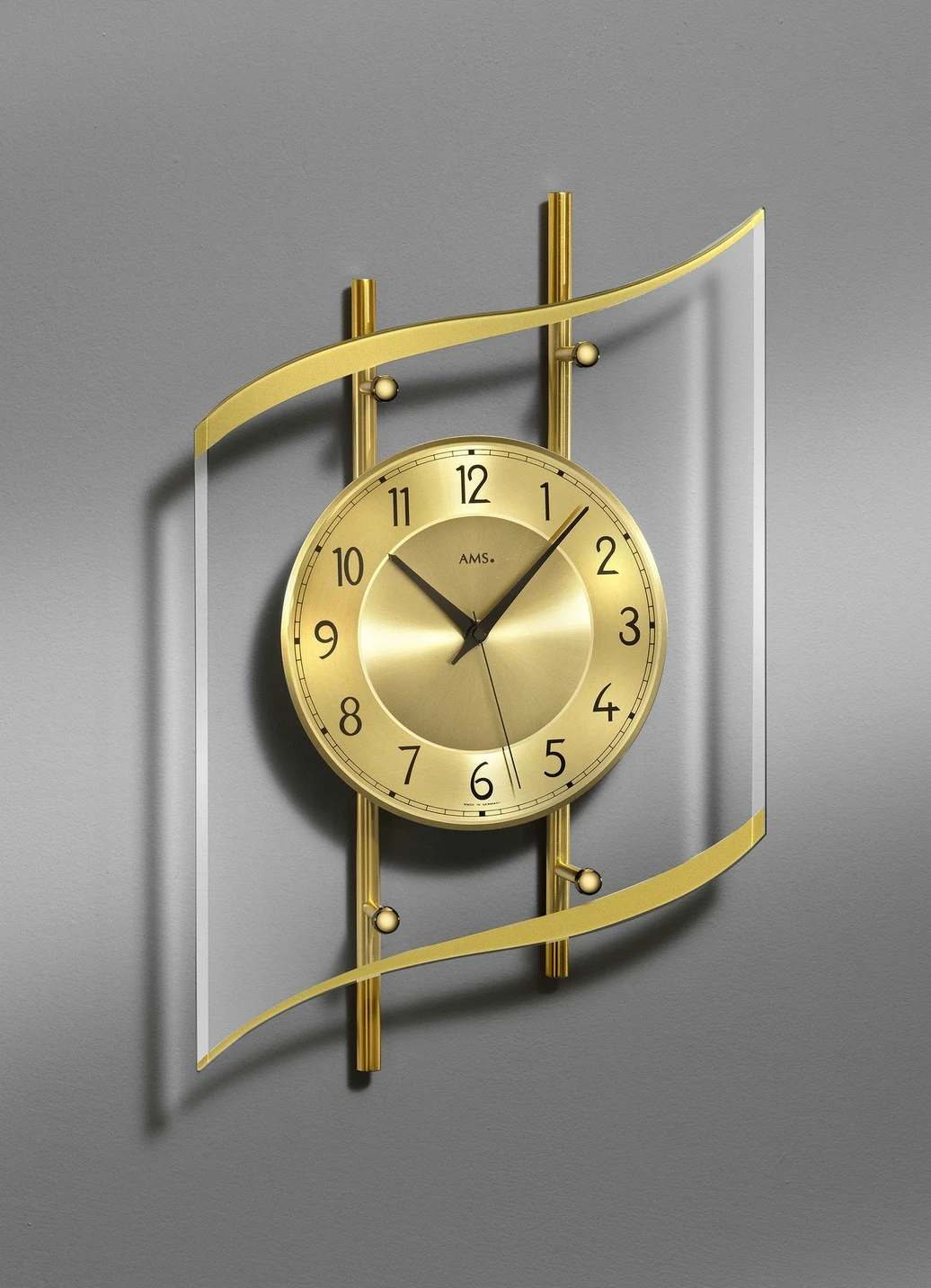 Edle, in Deutschland gefertigte Wanduhr mit hochwertigem Funkuhrwerk. Die Rückwand besteht aus zwei Metallstäben mit geschwungenem Mineralglas, das gold- bzw. silberfarben akzentuiert wurde. Metall-Zifferblatt mit arabischen Ziffern und Metallzeigern. Batteriebetrieben mit 1x 1,5 Volt Mignon (nicht im Lieferumfang enthalten). Maße: B29xH44,5x T7 cm