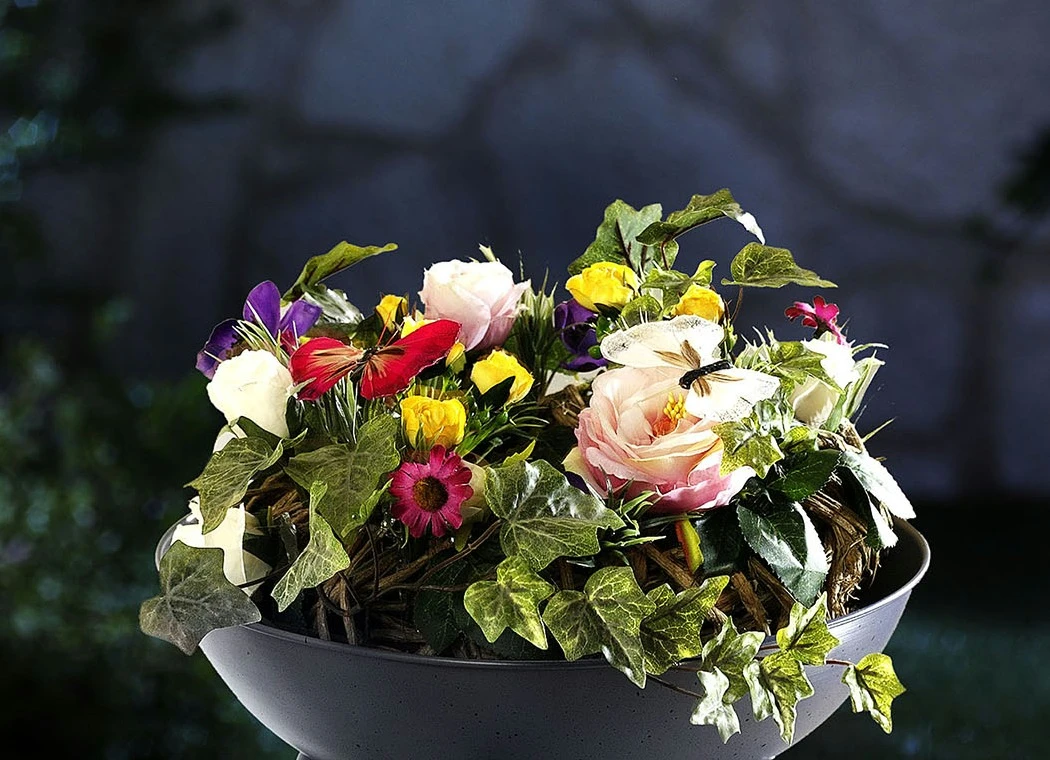 Auf einen Weidenkranz wurden Frühlingsblumen, Efeu und Schmetterlinge aufgebracht. Aus Kunst- und Textilmaterial gefertigt. Maße: ca. ø 30 cm, Höhe 17 cm.