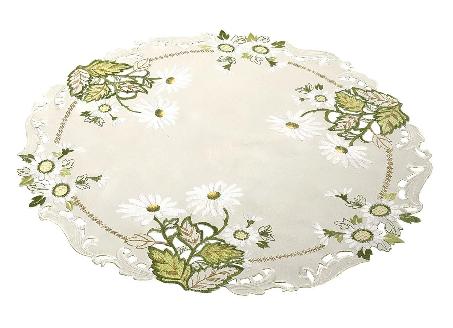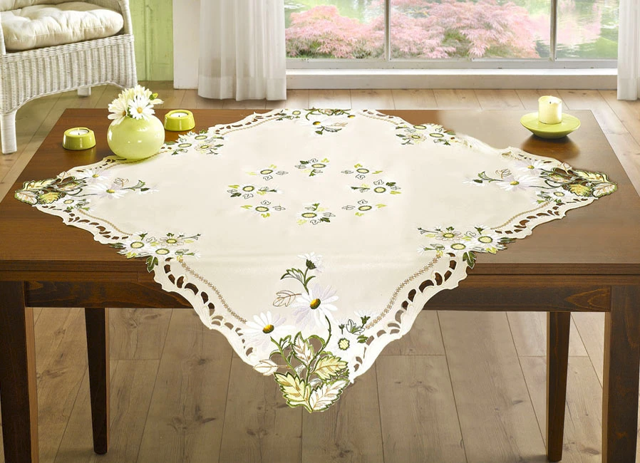 Zarte Gerberas zieren diese Accessoires in Größe 100 (Läufer, 30x 45 cm) und in Ecru-Bunt.