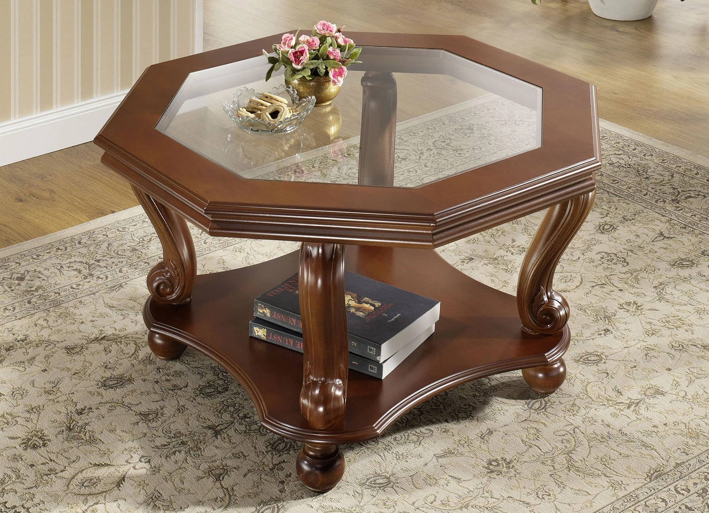 Zeitlos eleganter, teilmassiver Couchtisch in Nussbaumfarben. Achteckige Tischplatte, darunter Ablage. Beine aus Buche. Maße: B80xH48xT80 cm. Die Lieferung erfolgt aufgebaut.