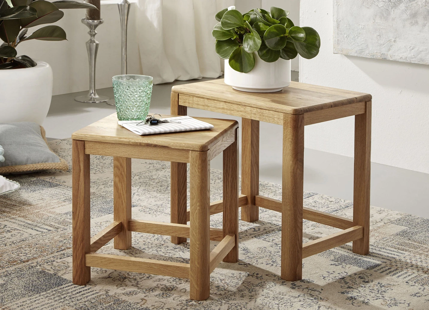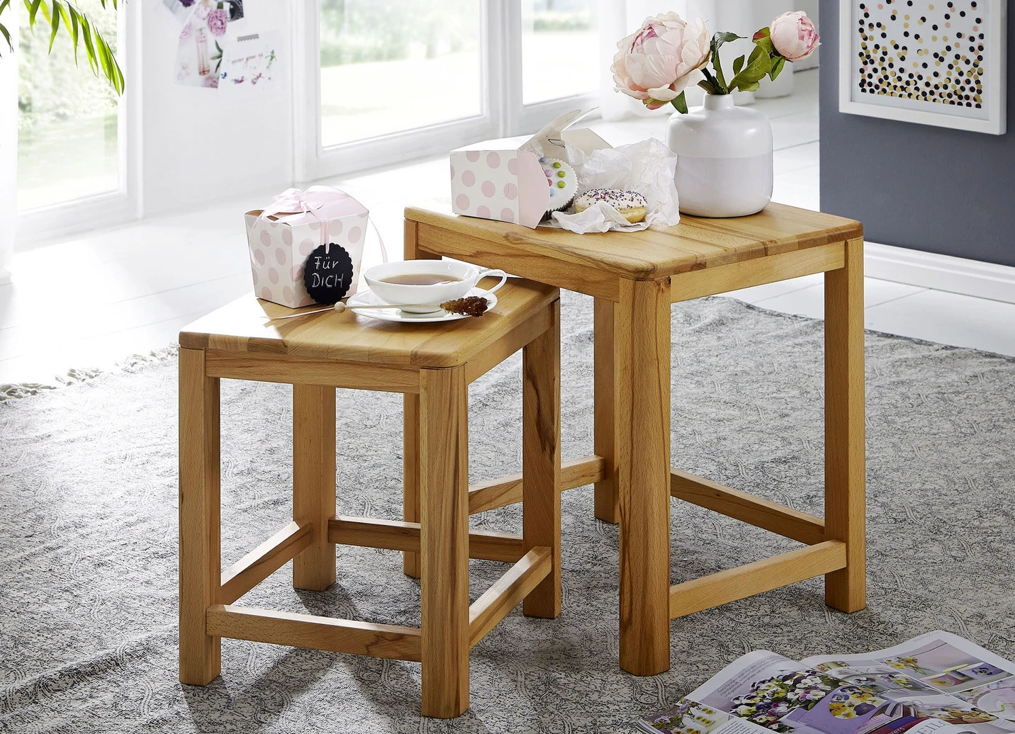 - Zweisatztische. Großer Tisch: B45xH45xT35 cm, kleiner Tisch: B35xH40xT33 cm